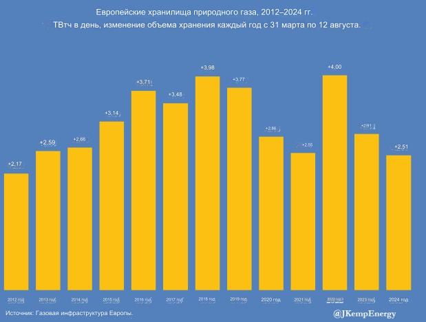 Это наименьшее накопление с 2012 года, по сравнению со средним десятилетним ростом в 443 ТВт-ч («Совокупные запасы в газовых хранилищах, GIE, 14 августа).