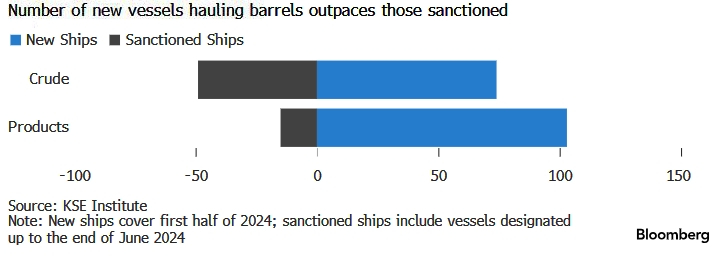 Согласно отчету KSE, аналогичная тенденция наблюдается и в отношении судов, перевозящих нефтепродукты. Более 100 новых судов, которые не перевозили российскую нефть в 2023 году, сделали это в первой половине этого года, что намного превышает количество, на которое были наложены санкции.
