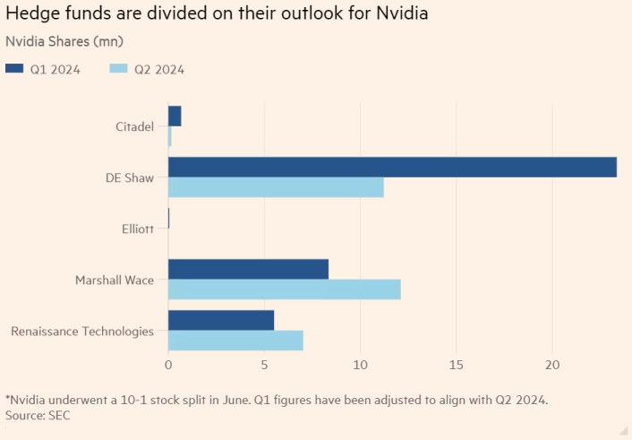 Хедж-фонды Citadel и DE Shaw сократили свои доли в Nvidia в преддверии падения фондового рынка в этом месяце, в то время как Renaissance и Marshall Wace увеличили свои позиции, что свидетельствует о резких разногласиях среди менеджеров по поводу перспектив гиганта-производителя микросхем.