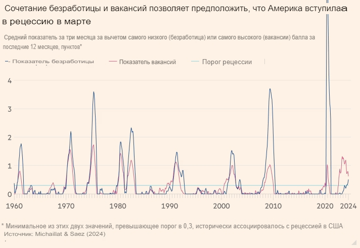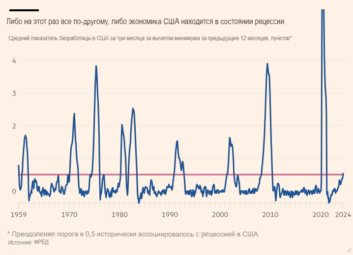 Главным из них является правило Сахма, первоначально задуманное экономистом Клаудией Сахм для запуска фискального стимулирования. Оно основано на исторической закономерности, согласно которой с 1970 года каждое увеличение более чем на 0,5 процентного пункта среднего трехмесячного показателя уровня безработицы по сравнению с его минимумом за предыдущие 12 месяцев совпадает с рецессией. Тревожно, что в июле этот индикатор вспыхнул красным цветом.