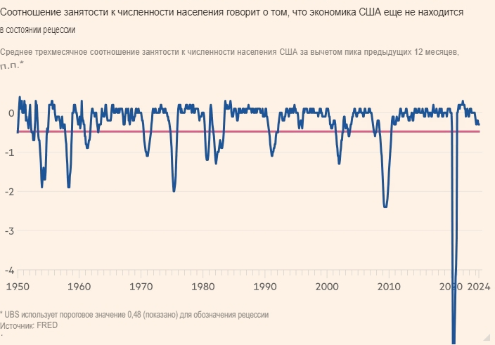 В этот момент взрослым следовало бы выработать более взвешенное суждение, основанное на других данных. Но вспышки инвесторов - это громко и неприятно, поэтому аналитики занялись разработкой дополнений. Например, один из них, представленный UBS на основе соотношения занятости к численности населения, успокаивает тем, что рецессия еще не наступила.