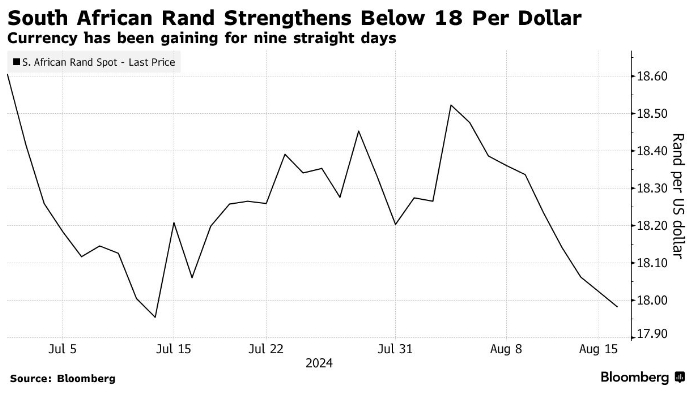 Южноафриканские активы завоевали расположение инвесторов после того, как два месяца назад к власти пришла коалиция, дружественная бизнесу, и экономические показатели страны начали улучшаться. Инфляция снизилась с февраля, что ослабило давление на центральный банк, требующее поддержания высоких процентных ставок. Ожидаемое начало снижения ставок Федеральной резервной системы в следующем месяце может открыть двери для политиков, чтобы последовать их примеру, сказал Марек Дримал, стратег Societe Generale SA.