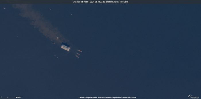 Буксировка платформы со второй производственной линией для «Арктик СПГ 2» через Обскую губу в направлении завода 16 августа (съемка Copernicus Data Space Ecosystem). Источник: Bloomberg