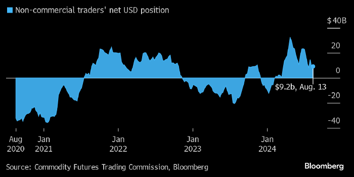 Чистая позиция крупных спекулянтов по доллару США (в млрд USD). Данные: CFTC, источник: Bloomberg