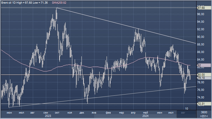 Цены на нефть снизились в понедельник, 19 августа, при этом цена Brent держится ниже 80 долларов за баррель, поскольку опасения по поводу спроса со стороны ведущего импортера нефти Китая оказали давление на настроения рынка, компенсировав риски для поставок со стороны Ближнего Востока.