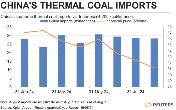 Более низкие цены на морской уголь помогли сохранить высокие объемы импорта в 2024 году: официальные данные показывают, что импорт всех сортов угля вырос на 13,3% за первые семь месяцев года до 295,78 млн тонн.