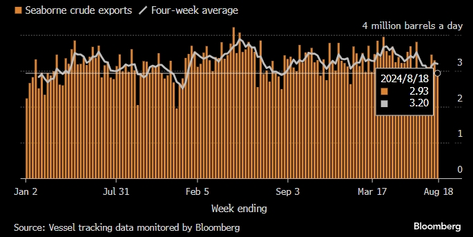 Это означает, что ежедневные морские поставки сырой нефти из России за неделю до 18 августа упали примерно на 360 000 баррелей до 2,93 млн, что является вторым недельным снижением подряд. Снижение недельного потока стало самым большим с начала июля.