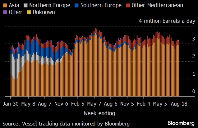 Наблюдаемые поставки российским клиентам в Азии, включая те, у которых нет известного конечного пункта назначения, за четыре недели до 18 августа снизились до 2,94 млн баррелей в день. Это примерно на 9% ниже среднего уровня, зафиксированного в апреле.