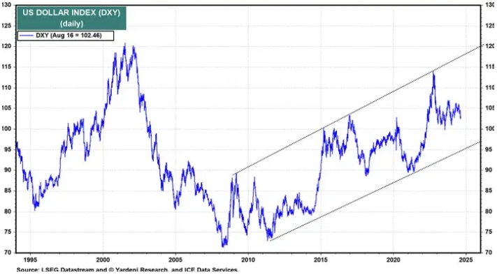 Доллар США ослаб в последние недели, поскольку процентные ставки упали из-за перспектив значительного снижения процентных ставок к концу года. Однако Ярдени считает, что рынок опередил сам себя, когда речь зашла о снижении процентных ставок, и если это так, то доллар США должен укрепиться.