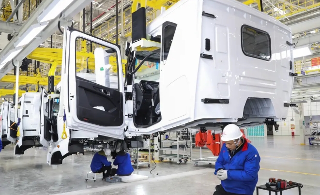 Рабочие производят коммерческий автомобиль BYD, работающий на новой энергии, на заводе в Хуайане, Китай, 11 января 2024 года. Costfoto/NurPhoto/Getty Images