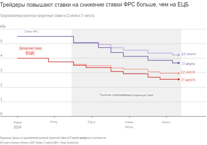 Напротив, трейдеры считают, что ФРС снизит ставки на 94 базисных пункта на трех оставшихся заседаниях в этом году, что подразумевает три снижения ставок на 25 базисных пунктов, с большой вероятностью одного более значительного шага. Это изменение примерно на 30 б.п. по сравнению с началом августа; цены инструментов на будущую ставку ЕЦБ изменились гораздо меньше.