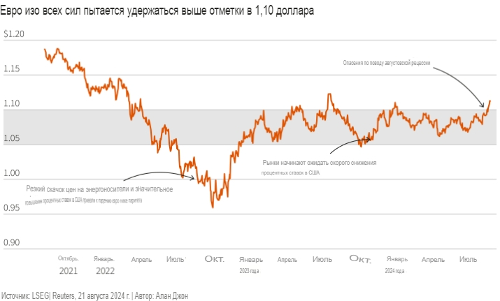 Решительно преодолев символический уровень $1,10, евро в августе вырос более чем на 2,5% и показал лучший месяц с ноября.
