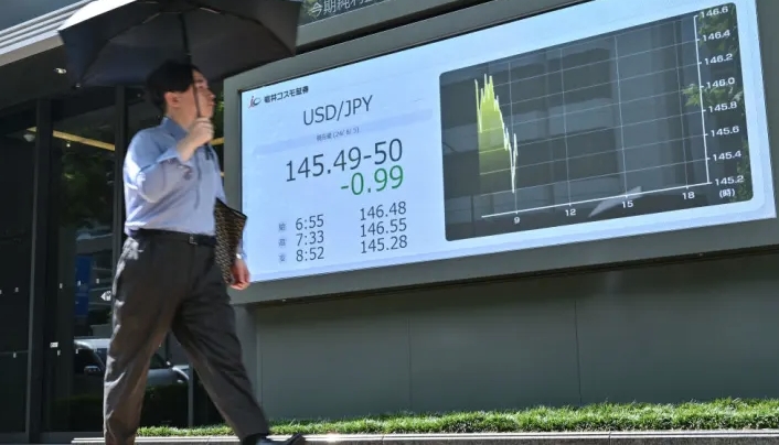 Прохожий идет мимо табло, показывающего курс обмена валют между долларом США и японской иеной, по улице в Токио 5 августа 2024 года. Ричард А. Брукс | Afp | Getty Images