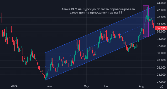 После начала атаки ВСУ на Курскую область биржевые цены на природный газ в Европе (TTF) подскочили примерно на 15% и достигли девятимесячных максимумов выше 40 евро за МВт·ч. Однако теперь рост котировок, вероятно, завершился по трем основным причинам, предупреждает стратег Goldman Sachs Саманта Дарт.