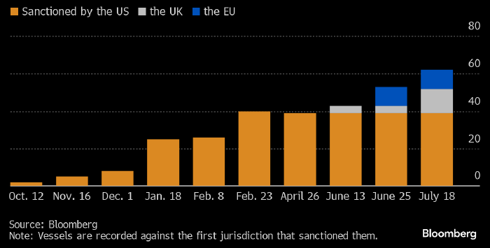 Число танкеров, попавших под санкции США (оранжевым), Великобритании (серым) и ЕС (синим) за перевозку российской нефти. Источник: Bloomberg
