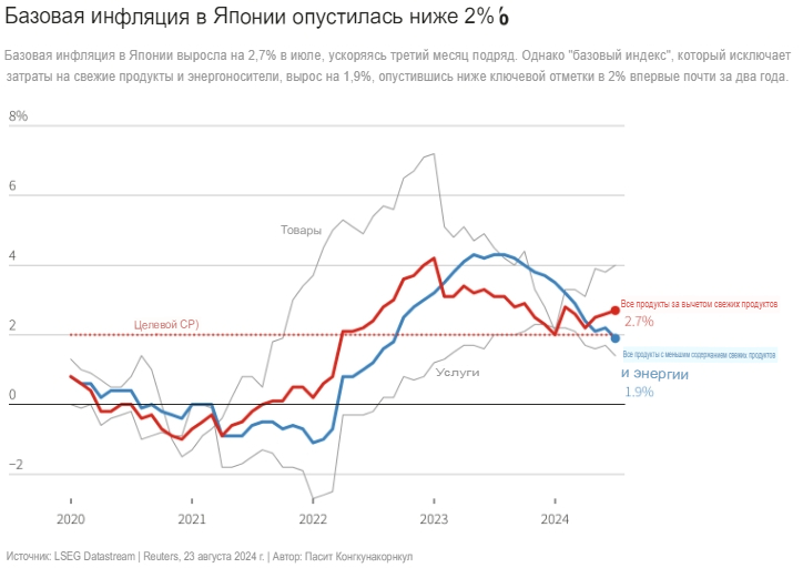 Особенно это касается иены, касаемо которой глава Банка Японии Кадзуо Уэда заявил в парламенте, что центральный банк будет продолжать повышать ставки до тех пор, пока поступающие экономические данные будут соответствовать текущим ожиданиям. И в этом плане последние данные по японской инфляции оказались как нельзя кстати: годовой прирост базовых потребительских цен за июль составил 2,7%, как и ожидалось.