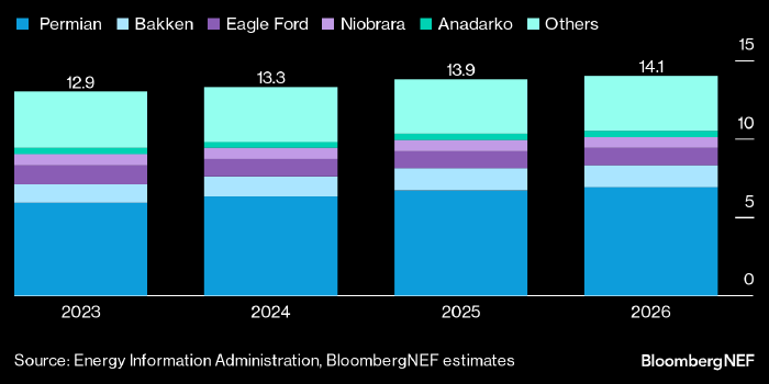 Добыча нефти в США в млн б/д: исторические данные и прогноз BloombergNEF. Источник: Bloomberg
