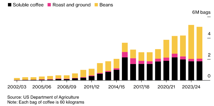 Рост стоимости жизни по всему миру также способствовал переходу к более дешевым кофейным смесям, а растущая потребительская база в Китае начала наращивать импорт растворимого и зернового кофе. Другие продукты с высоким содержанием робусты также набирают популярность. По данным компании Keurig Dr Pepper Inc., рынок готового к употреблению кофе в банках или бутылках в США в прошлом году оценивался в $4 миллиарда. По тем же данным, рынок рос в среднем на 5% в год за три года, закончившихся в 2023 году.