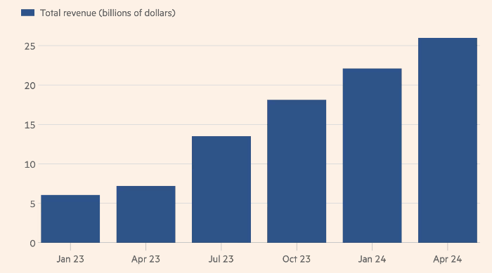 Отчеты о доходах от крупных технологических компаний, участвующих в гонке за доминирование в области ИИ, дали представление о расходах, от которых выиграла Nvidia. В своих квартальных результатах в июле Google сообщила о еще одном увеличении капитальных затрат, которые выросли до $13 млрд за квартал, закончившийся в июне, отчасти отражая продолжающиеся расходы на чипы Nvidia. Meta, Microsoft и Amazon аналогично сообщили, что планируют продолжать значительные расходы на ИИ.