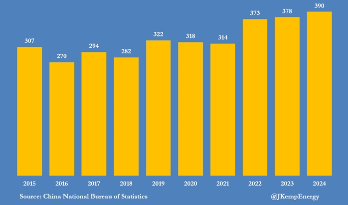 Китайские угольщики увеличили добычу до сезонного рекорда в 390 миллионов тонн в июле 2024 года по сравнению с 378 миллионами в том же месяце годом ранее и 373 миллионами в 2022 году.