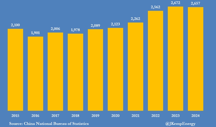 В июле 2024 года рекордная выработка электроэнергии на гидро- и солнечных электростанциях сократила выработку тепловой энергии, в основном на угле, на 25 миллиардов киловатт-часов (кВт-ч) по сравнению с предыдущим годом, что стало первым сезонным спадом как минимум за десятилетие.
