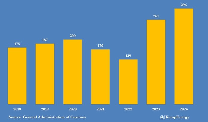 В то же время импорт вырос до сезонного рекорда в 296 миллионов тонн за первые семь месяцев с 261 миллиона тонн в 2023 году и 139 миллионов тонн в 2022 году.