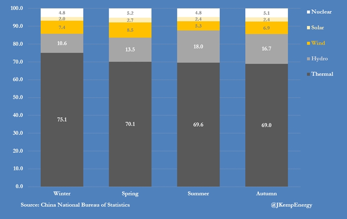 Доля в выработке электроэнергии в Китае, разбитая по сезонам: зима — весна — лето — осень.