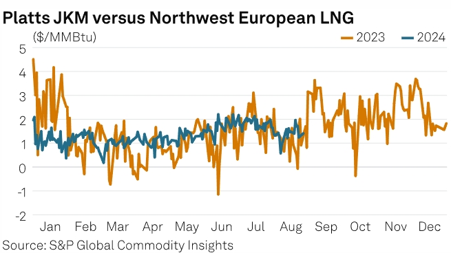 Platts оценил разницу между JKM и NWE в 1,674 долл. США/MMBtu, что является самой высокой премией для JKM по сравнению с NWE на протяжении всей форвардной кривой.