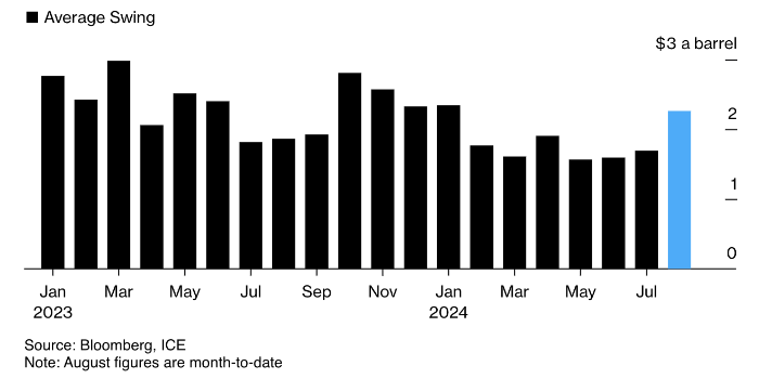 Фьючерсы на нефть марки Brent в августе торговались в диапазоне $2,29 в среднем за день. Это максимум с января. Другой показатель колебаний цен, 30-дневная историческая волатильность, также является самым высоким с января. Трейдеры готовятся к новому неспокойному периоду в конце года: альянс ОПЕК+ начнет постепенно сворачивать ограничения поставок, поэтому баррели вернутся на рынок.