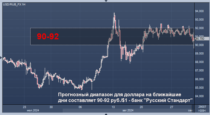 Прогнозный диапазон для доллара на ближайшие дни составляет 90-92руб./$1, для евро - 99-101 руб./EUR1, полагает директор департамента операций на финансовых рынках банка "Русский Стандарт" Максим Тимошенко.