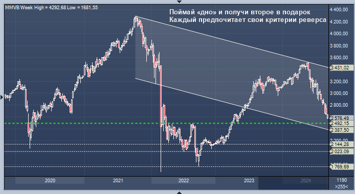 Еще до последнего похода наверх полгода назад от 3 000 пунктов по индексу МБ я говорил (хотя и ошибся по факту), что мне больше нравится 2 500 в качестве цели. 2000-2500 - старый диапазон. Отскок от его верхней границы был бы закономерным. Возвращение внутрь него вполне допустимо (зависит от нагнетания указанной выше истерии в истории с последствиями конфликта). Старое и первое правило любого технаря «тренд скорее продолжится, чем изменится» не позволяет говорить о том, что первый отскок станет сменой меджвежьего тренда на бычий. Лучше подождать несколько таких или формирование U-образного основания (нежели V-образного, шиповидного), хотя для акций своейственно все же отдавать приоритет бычьим формациям вследствие глобального инфляционного многовекового тренда (определяющего стоимость активов и как следствие цен акций — недвижимость, интеллектуальная собственность и пр.). Так что по-прежнему, пока 2 500.