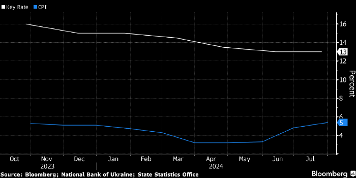 Белым — ключевая процентная ставка Нацбанка Украины, голубым — потребительская инфляция в стране. Источник: Bloomberg
