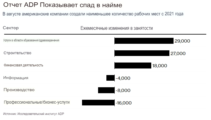 По данным ADP, частные работодатели добавили 99 000 рабочих мест в прошлом месяце. Это ниже ожиданий экономистов в 145 000 рабочих мест и пересмотренных в сторону понижения 111 000 рабочих мест, добавленных в июле.