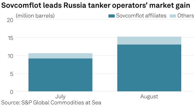 Данные S&P Global показали, что танкеры, принадлежащие компании, на которую распространяются санкции различных западных властей, в прошлом месяце погрузили 20,9 млн баррелей российской сырой нефти по сравнению с 12,8 млн баррелей в июле.