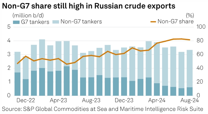 По данным CAS и MIRS, 81,5% российского экспорта сырой нефти в августе было перевезено танкерами, не плавающими под флагами, не принадлежащими или не эксплуатируемыми компаниями из стран G7, ЕС, Австралии, Швейцарии и Норвегии и не застрахованными западными клубами защиты и возмещения ущерба.