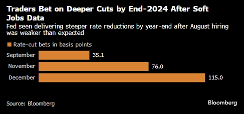 Трейдеры, торгующие свопами, немного повысили вероятность того, что центральный банк США снизит ставки на полпроцента, когда они соберутся позднее в этом месяце для первого ожидаемого снижения более чем за четыре года. Вероятность существенного сокращения выросла примерно до 50% с примерно 36% до публикации данных. На весь 2024 год контракты теперь предполагают сокращение примерно на 115 базисных пунктов по сравнению со 108 базисными пунктами ранее в ходе сессии.