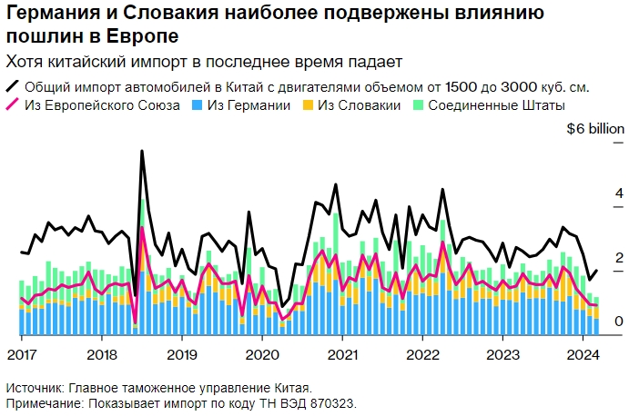 Германия и Словакия наиболее подвержены любым тарифам в Европе. Хотя в последнее время китайский импорт снижается. Источник: Главное таможенное управление Китая. Примечание: Показан импорт по коду ТН ВЭД 870323