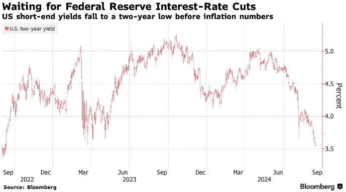 Казначейские облигации США выросли, в результате чего доходность двухлетних облигаций достигла самого низкого уровня с 2022 года в преддверии публикации данных по инфляции, которые могут закрепить ожидания в отношении размера снижения процентной ставки Федеральной резервной системой в этом месяце.