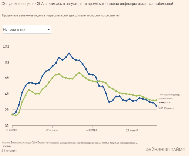 Инфляция в США снизилась до 2,5 процента год к году в августе, что создает предпосылки для того, чтобы Федеральная резервная система начала снижать процентные ставки на своем заседании на следующей неделе. Августовский годовой индекс потребительских цен упал по сравнению с июльским показателем в 2,9 процента год к году и оказался немного ниже прогноза в 2,6 процента год к году, сделанного экономистами, опрошенными Reuters.