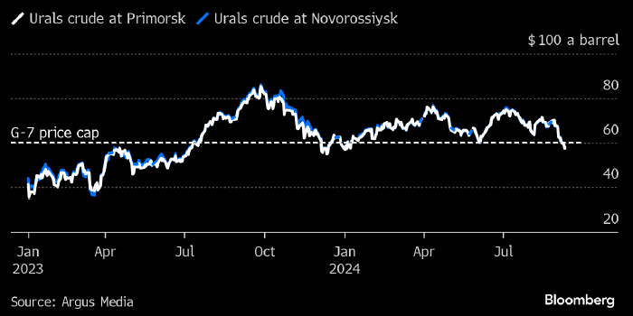 Цена российской нефти Urals опустилась ниже отметки в $60 за баррель, которая является «потолком», установленным странами G7 для морского экспорта из РФ. После недавнего падения мировых цен на черное золото, смесь Urals в балтийском порту Приморск и черноморском порту Новороссийск во вторник стоила $57,44 и $57,79 за баррель соответственно, пишет Bloomberg со ссылкой на данные Argus Media.