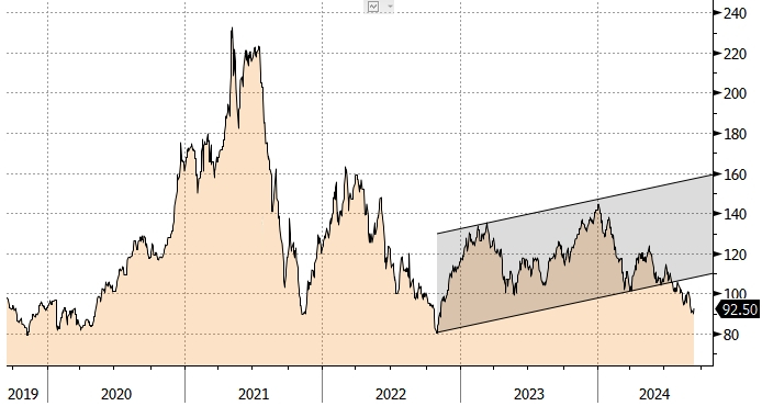 Расчеты Bloomberg Intelligence показывают, что рынок железной руды в 2024 году будет в профиците, а спотовая цена в конце года составит 90 долларов за тонну.