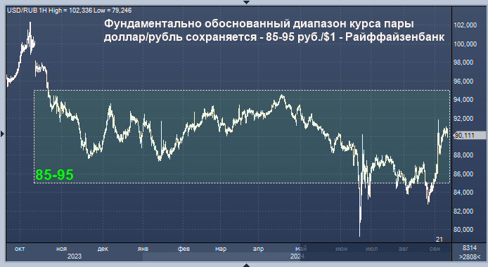 Отсутствие существенных колебаний в фундаментальных факторах сдерживает волатильность рубля, обоснованный диапазон курса пары доллар/рубль сохраняется на уровнях 85-95 руб./$1, считают аналитики Райффайзенбанка.