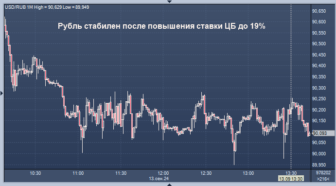 «Совет директоров Банка России 13 сентября 2024 года принял решение повысить ключевую ставку на 100 б.п., до 19% годовых. Текущее инфляционное давление остается высоким. Годовая инфляция по итогам 2024 года, вероятно, превысит июльский прогнозный диапазон 6,5–7,0%. Рост внутреннего спроса все еще значительно опережает возможности расширения предложения товаров и услуг. Требуется дополнительное ужесточение денежно-кредитной политики, для того чтобы возобновить процесс дезинфляции, снизить инфляционные ожидания и обеспечить возвращение инфляции к цели в 2025 году. Мы допускаем возможность повышения ключевой ставки на ближайшем заседании. По нашему прогнозу, с учетом проводимой денежно-кредитной политики годовая инфляция снизится до 4–4,5% в 2025 году и будет находиться вблизи 4% в дальнейшем», - сказано в релизе ЦБ.