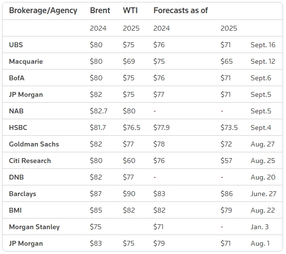 Ниже приведен список последних прогнозов брокеров по средним ценам на нефть Brent и WTI на 2024 и 2025 годы (в долларах за баррель):