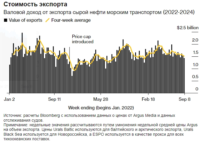 По данным издания, валовая стоимость экспорта нефти, который в значительной степени зависит от продажи сырой нефти, за неделю, завершившуюся 8 сентября, снизилась до 1,44 миллиарда долларов по сравнению с 1,52 миллиарда долларов, полученных на предыдущей неделе. Это самая низкая сумма, полученная Россией от экспорта нефти с января, несмотря на то, что за последнюю неделю страна добывала на 40 000 баррелей нефти в день больше.