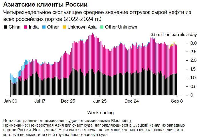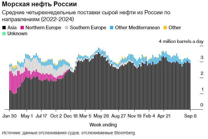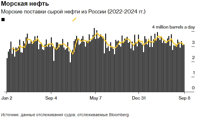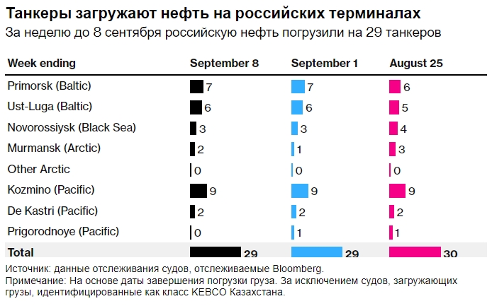 Россия также продает меньше нефти, чем в предыдущие годы, по причине снижения спроса со стороны азиатских клиентов и перебоям в работе нефтепровода в Венгрии в августе. Средний четырехнедельный объем продаж нефти в России по состоянию на 8 сентября снизился до 3,13 млн баррелей в день, что на 30 000 баррелей в день меньше, чем в предыдущем месяце.