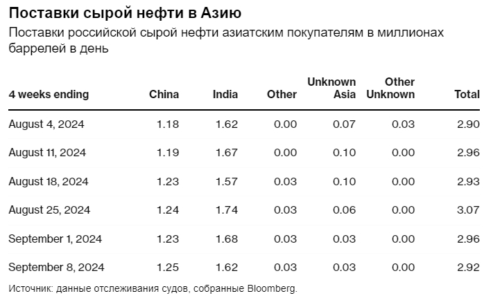 Наблюдаемые поставки российской нефти в Азию, в частности, снизились в среднем до 2,92 млн баррелей в день в месяц за этот период, что примерно на 10 % ниже среднего уровня поставок в начале этого года, говорится в отчете.
