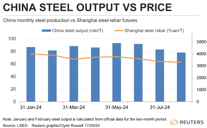 Китай, который производит чуть более половины стали в мире, испытывает трудности с повышением спроса, особенно в ключевом секторе строительства недвижимости, где целый ряд мер стимулирования пока не принес результатов.