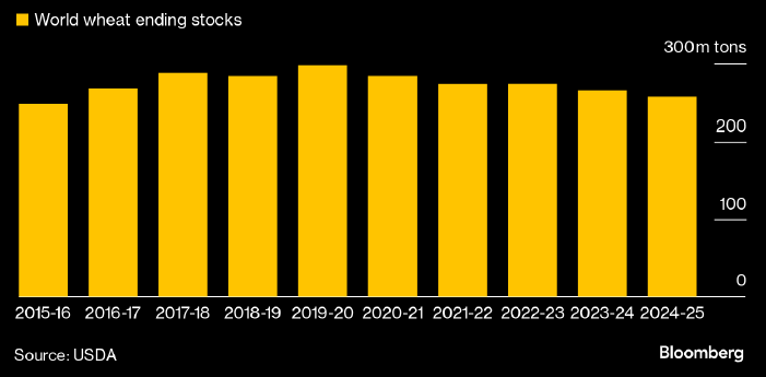 Мировые запасы пшеницы (в млн тонн) находятся на девятилетнем минимуме. Данные: Минсельхоз США, источник: Bloomberg