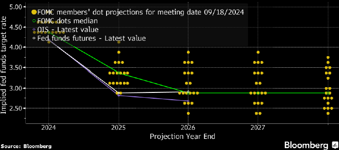 Обновляемый ежеквартально медианный прогноз членов FOMC по динамике ставки («dot plot») предполагает, что к концу года она опустится до 4,38%, а к концу 2025 года — до 3,38%. Таким образом, реализация данного прогноза предполагает снижение ставки по федеральным фондам к концу года — после сегодняшнего снижения — еще на 62 б.п.